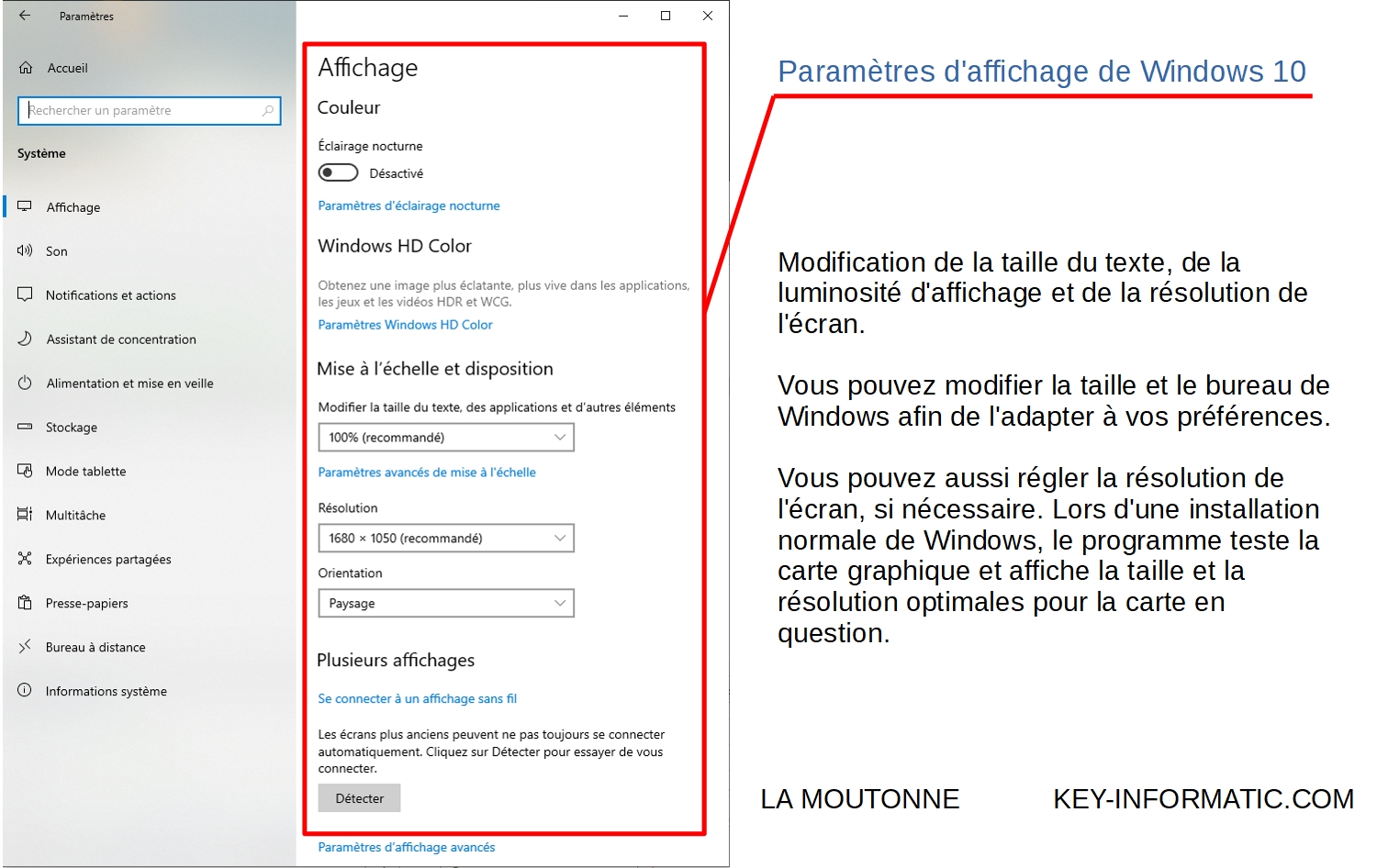 Windows 10 divise ces paramètres en plusieurs catégories: les paramètres d'écran pour changer la résolution d'écran, le mode d'affichage, la gestion multi-écran et les paramètres personnalisés pour changer le papier peint, les couleurs et les polices.